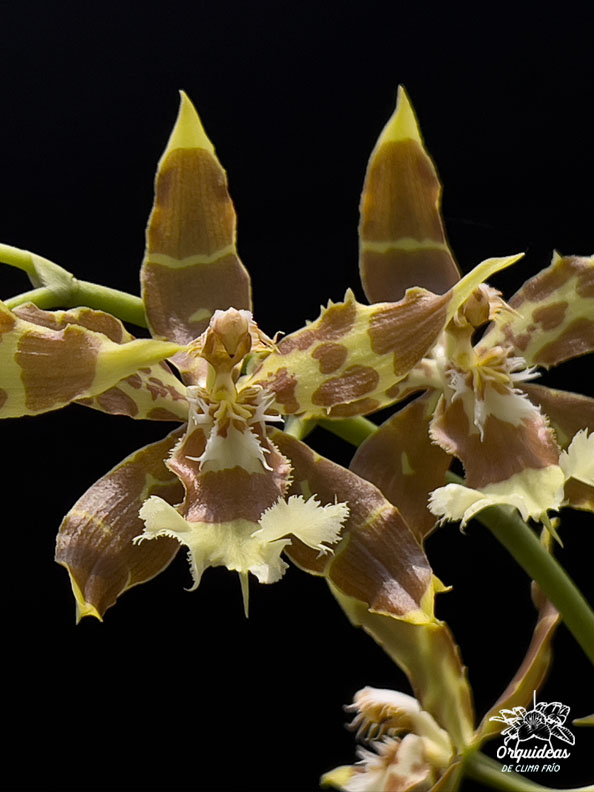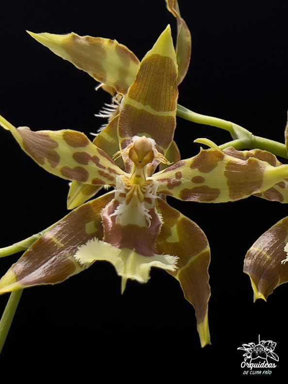 La Odontoglossum luteopurpureum es una especie de orquídea que se distingue por sus flores de colores vibrantes y su atractiva apariencia. Originaria de las regiones montañosas de América del Sur, como Ecuador y Perú, esta orquídea crece como una planta epífita en hábitats frescos y húmedos. Sus flores son grandes y llamativas, con pétalos y sépalos que presentan tonos amarillos y morados, lo que le da su nombre. La Odontoglossum luteopurpureum es apreciada por su hermosa floración y su capacidad para agregar un toque de color y elegancia a cualquier colección de orquídeas. Se cultiva con cuidado en condiciones de alta humedad y temperaturas frescas a intermedias para garantizar su salud y desarrollo óptimos.